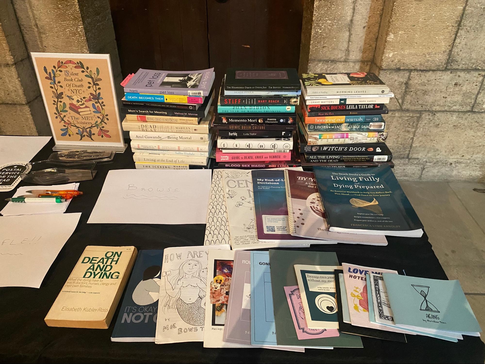 Lauren uses these monthly meet ups as a way to connect to other death care professionals, as well as the morbidly curious. She hosts these events at various places of disposition and death themed spaces such the historic Green-Wood cemetery, Morbid Anatomy Library, Sparrow: A Contemporary Funeral Home, gothic themed and queer owned coffee shops, and The Met Cloisters. She provides a stack of books for readers to choose from from her own library, as well as a free resource pile where attendees can find materials and stickers on grief, disposition and memorial services, organizations doing incredible work in the death and dying space around the incarcerated, ship wrecks transporting enslaved people, houseless persons, and more.