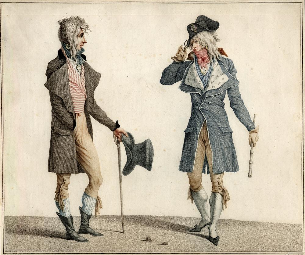 Men sporting felt hats and monocles. Colored illustration (1796) via the British Museum.
